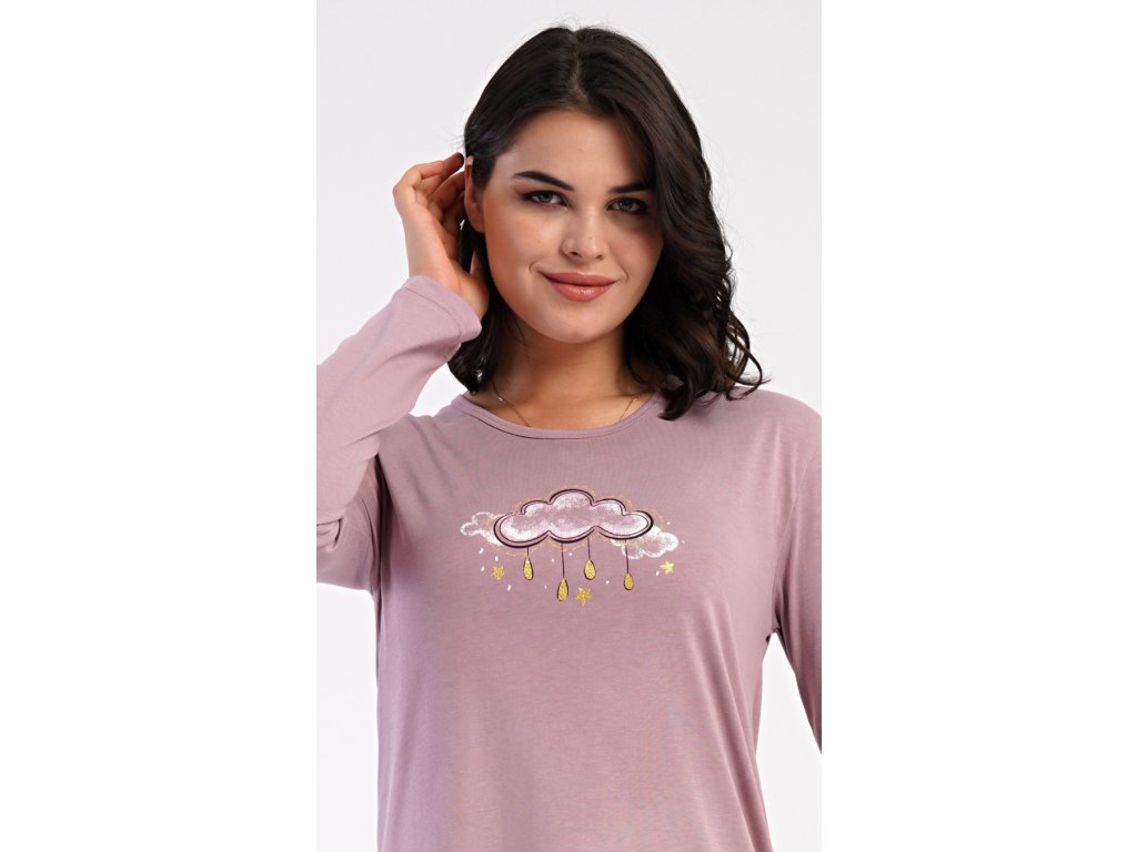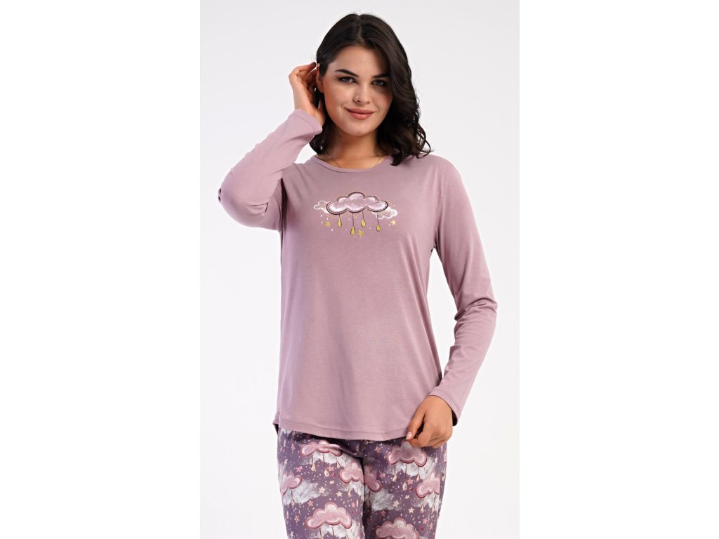 Dámské bavlněné dlouhé pyžamo Amelia. Dámské pyžamo se skládá z trika s dlouhým rukávem a dlouhých kalhot. Jednobarevné triko s kulatým výstřihem zdobí obrázek obláčku. Tento motiv se opakuje i na kalhotách, které mají v pase gumu a šňůrku na stažení, nemají kapsy. Použitý bavlněný materiál je poddajný a příjemný na dotek.