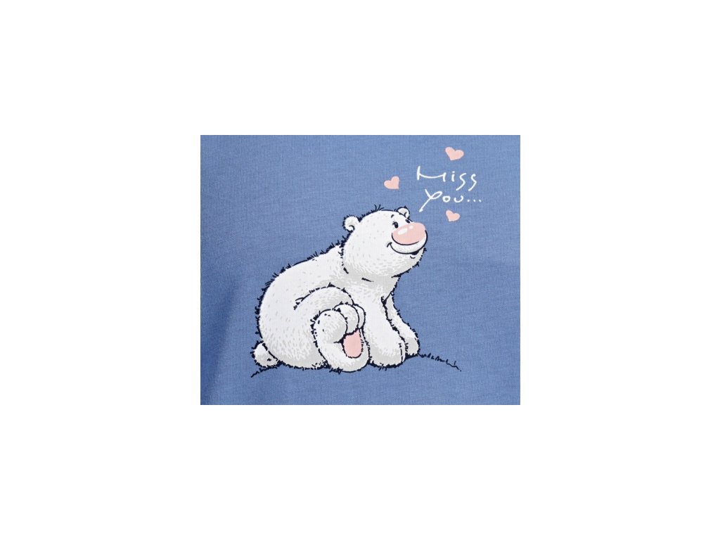 Dámské bavlněné dlouhé pyžamo Tučňák a méďa. Dámské pyžamo se skládá z trika s dlouhým rukávem a dlouhých kalhot. Triko s kulatým výstřihem je ozdobeno obrázky ledních medvědů. Tento motiv se opakuje i na kalhotách, které mají v pase gumu a šňůrku na stažení, nemají kapsy. Použitý bavlněný materiál je poddajný a příjemný na dotek.