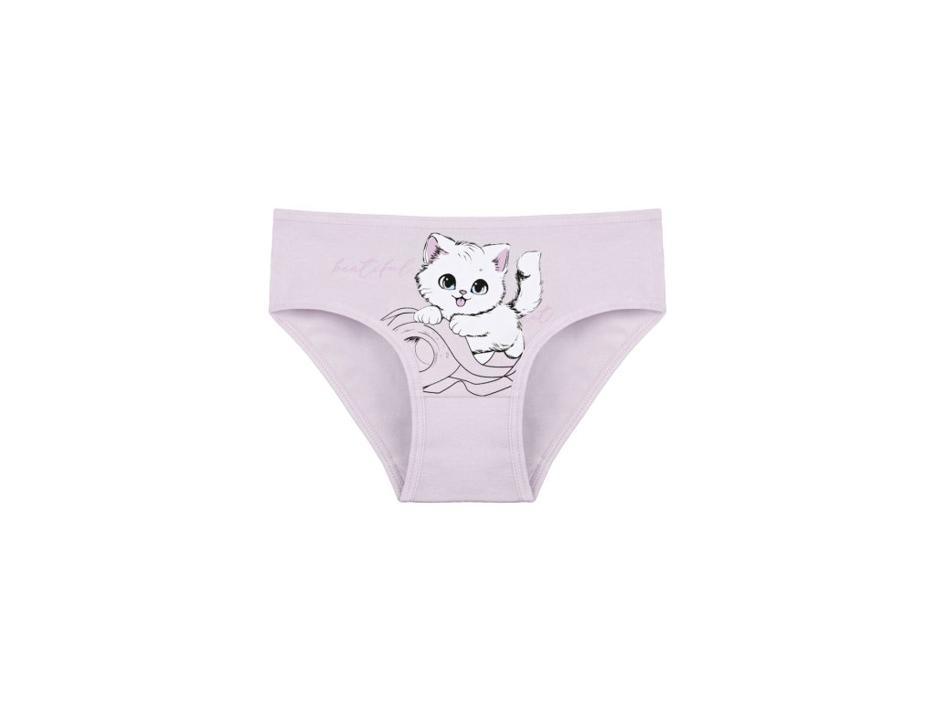 Dětské bavlněné kalhotky Kočička. Dětské kalhotky klasického střihu jsou pohodlné a slušivé, zdobí je obrázek kotěte. Obzvláště oceníte materiálové složení - 95% bavlna a 5% elasten. Použitý materiál je příjemný a poddajný na dotek.