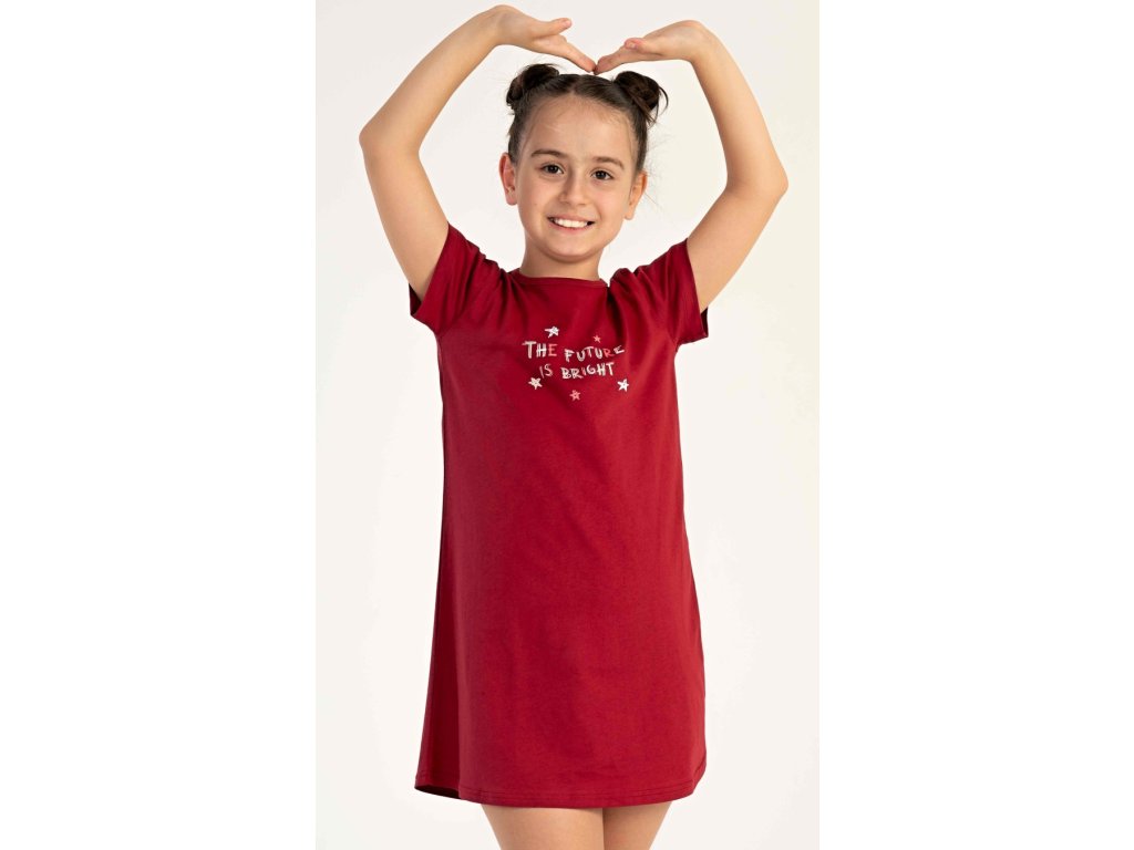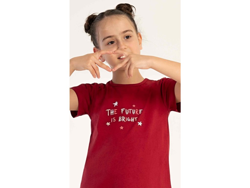 Dětská bavlněná noční košile s krátkým rukávem Hvězdičky. Na jednobarevné košilce s krátkým rukávem je obrázek hvězdiček a nápis 'The future is bright'. Použitý bavlněný materiál je poddajný a příjemný na dotek.