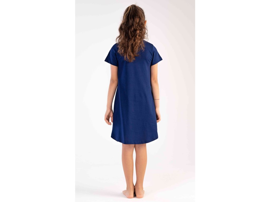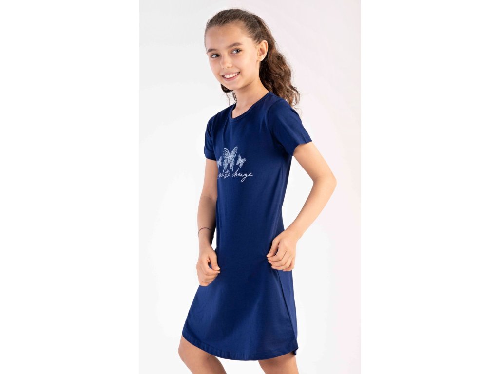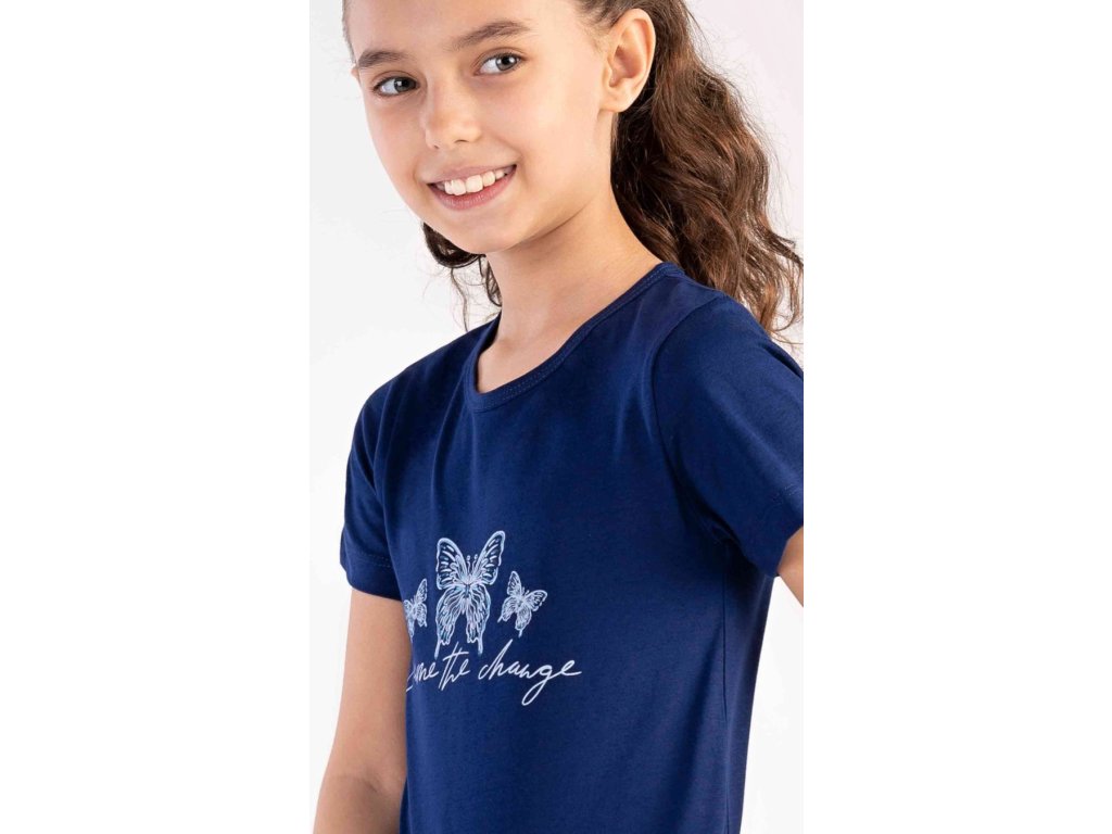 Dětská bavlněná noční košile s krátkým rukávem Motýlci. Na jednobarevné košilce s krátkým rukávem je obrázek tří motýlků. Použitý bavlněný materiál je poddajný a jemný na dotek.