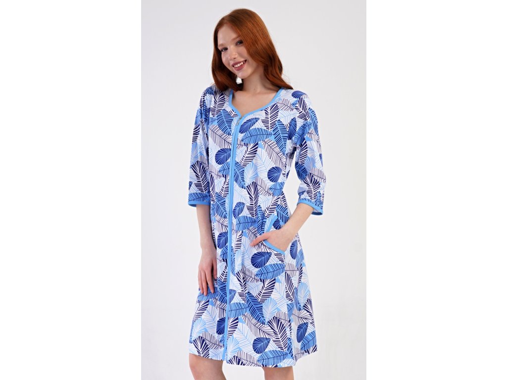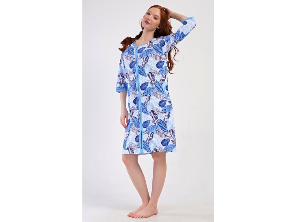 Dámské bavlněné domácí šaty s tříčtvrtečním rukávem Julie. Pohodlné rozepínací šaty v příjemné délce pod kolena využijete téměř při všech volnočasových aktivitách. Mají praktické kapsy a zapínání na zip. Šaty jsou potištěny listy. Použitý bavlněný materiál je příjemný a poddajný na dotek.