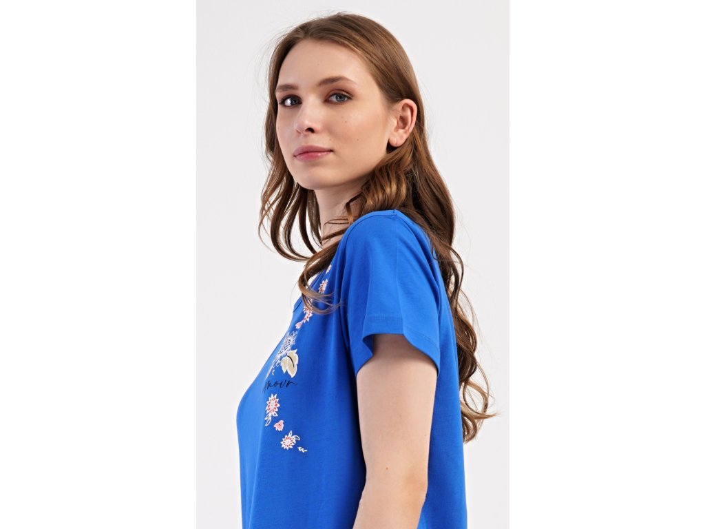 Dámské bavlněné domácí šaty s krátkým rukávem Květy. Domácí jednobarevné šaty s kulatým výstřihem a kapsami zdobí na hrudi květinový motiv a nápys 'Amour'. Použitý bavlněný materiál je příjemný a poddajný na dotek. Šaty jsou pohodlné, vhodné na spaní i na denní nošení.