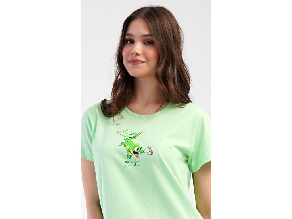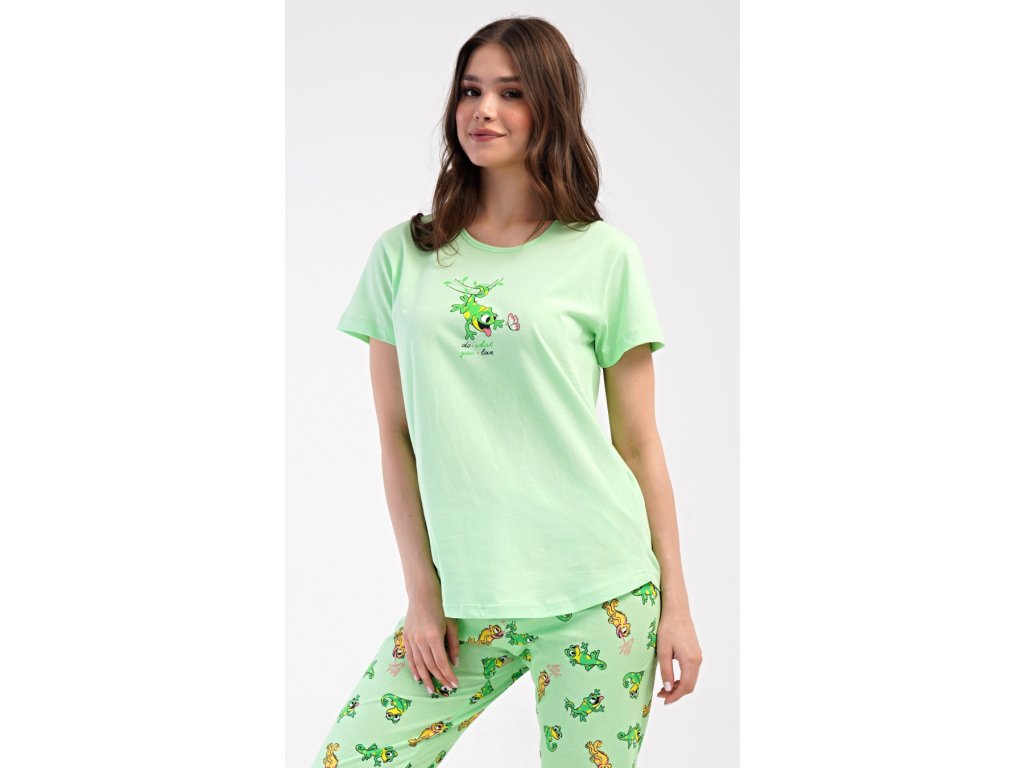 Dámské bavlněné kapri pyžamo Ella. Dámské pyžamo se skládá z trička s krátkým rukávem a tříčtvrtečních kalhot. Tričko s kulatým výstřihem zdobí obrázek veselé ještěrky. Tento motiv se opakuje i na kalhotách, které mají v pase gumu a šňůrku na stažení, jsou bez kapes. Použitý bavlněný materiál je příjemný a poddajný na dotek.
