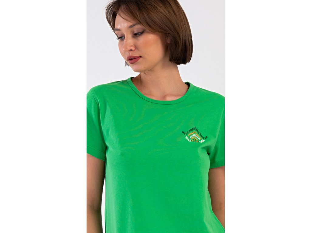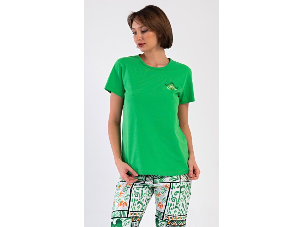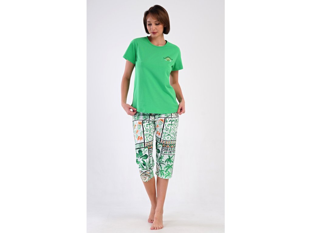 Dámské bavlněné kapri pyžamo Janette. Dámské pyžamo se skládá z trička s krátkým rukávem a tříčtvrtečních kalhot. Tričko s kulatým výstřihem zdobí na hrudi drobný obrázek. Kalhoty s potiskem exotických motivů mají v pase gumu a šňůrku na stažení, jsou bez kapes. Použitý bavlněný materiál je příjemný a poddajný na dotek.