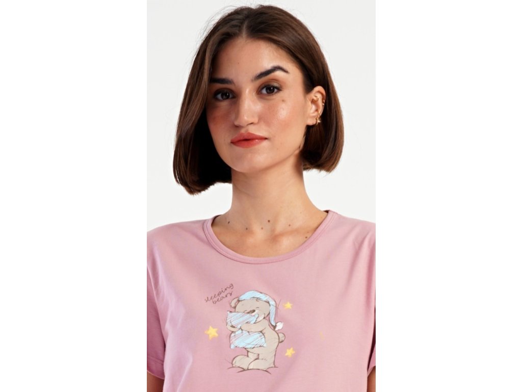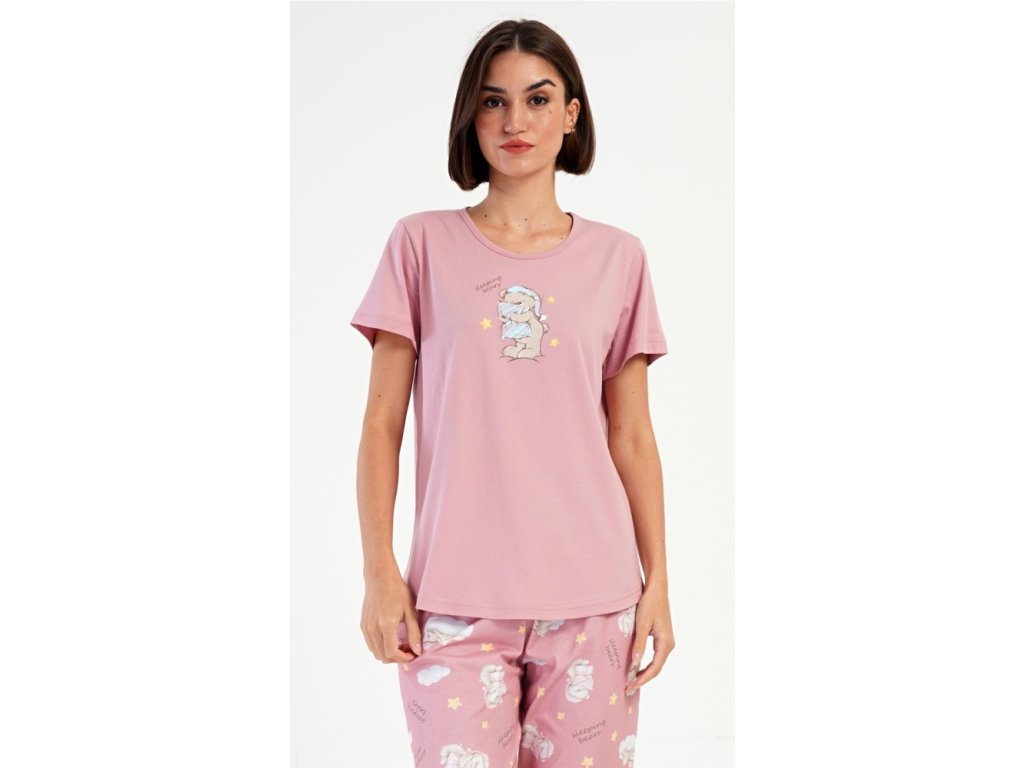 Dámské bavlněné kapri pyžamo Méďa s polštářem. Dámské pyžamo se skládá z trička s krátkým rukávem a tříčtvrtečních kalhot. Tričko s kulatým výstřihem má na hrudi obrázek medvídka s polštářem a čepičkou. Tento motiv se opakuje i na kalhotách, které mají v pase gumu a šňůrku na stažení, jsou bez kapes. Použitý bavlněný materiál je příjemný a poddajný na dotek.