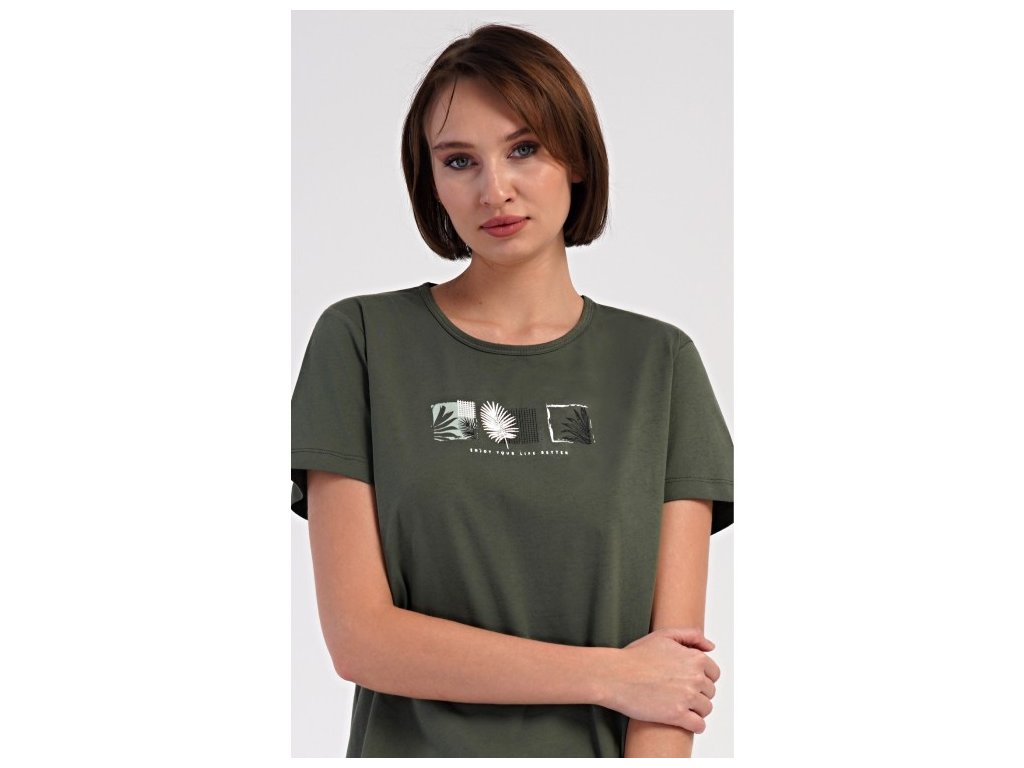 Dámské bavlněné pyžamo šortky Barbora. Dámské pyžamo se skládá z trička s krátkým rukávem a šortkových kalhot. Na jednobarevném tričku jsou obrázky palmových listů. Stejný motiv se opakuje i na šortkách, které mají v pase gumu a šňůrku na stáhnutí, jsou bez kapes. Použitý bavlněný materiál je příjemný a poddajný na dotek.