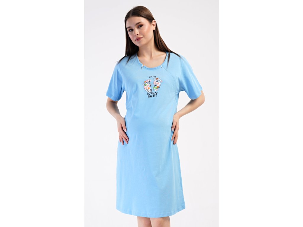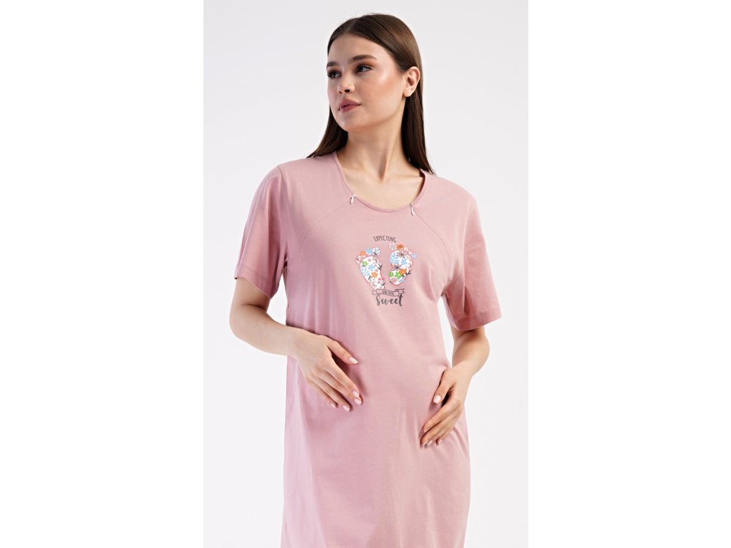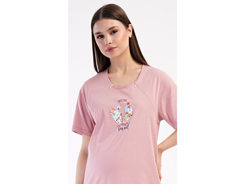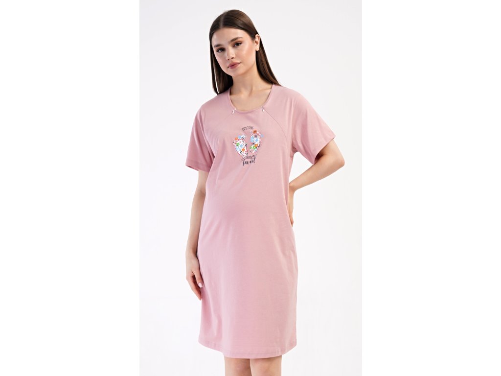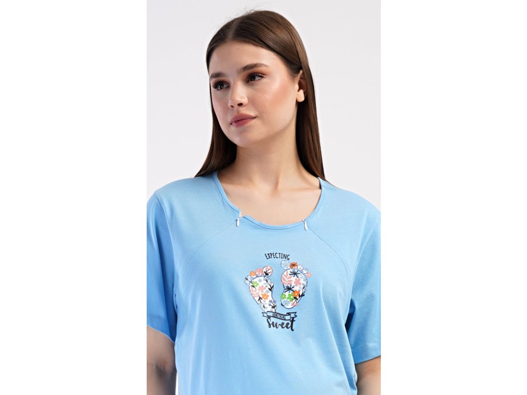 Dámská bavlněná mateřská noční košile Sweet. Noční košile je svým střihem určená na dobu těhotenství, do porodnice i ke kojení. Ke kojení slouží průstřihy po stranách košile, které jsou uzavíratelné na zip. Přední díl košile zdobí obrázek dětských nožiček. Použitý materiál s podílem bavlny 100% je příjemný a poddajný na dotek.