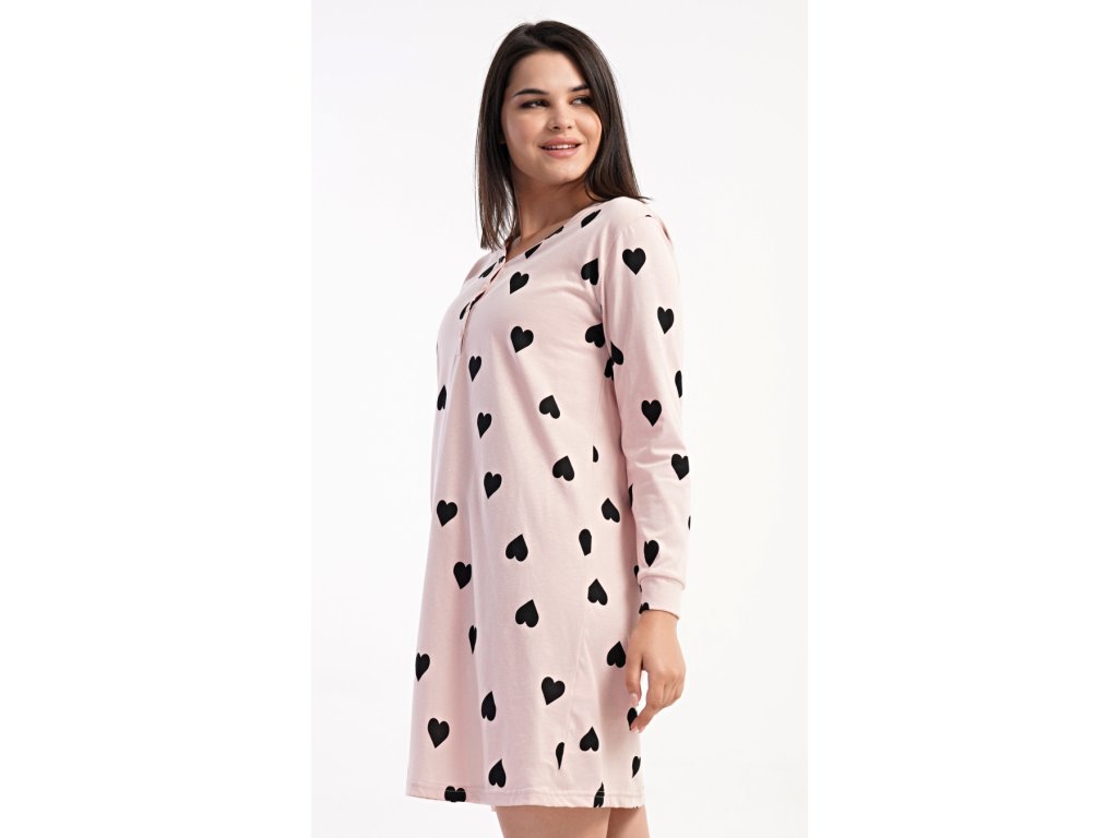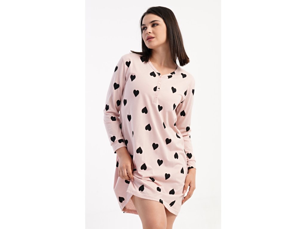 Dámská bavlněná noční košile s dlouhým rukávem Srdce. Noční košile s kulatým výstřihem a légou na knoflíčky má příjemnou délku nad kolena. Látka košile je potištěna srdíčky, dlouhý tukáv je zakončen manžetou. Použitý materiál s podílem bavlny 100% je příjemný a poddajný na dotek.