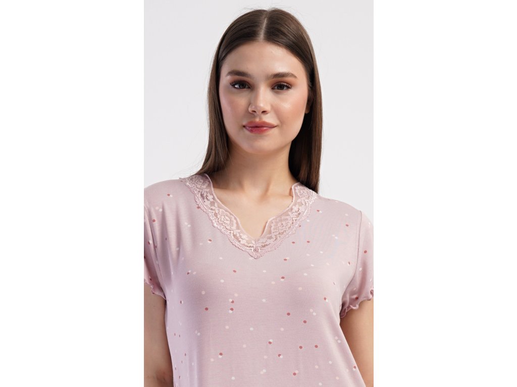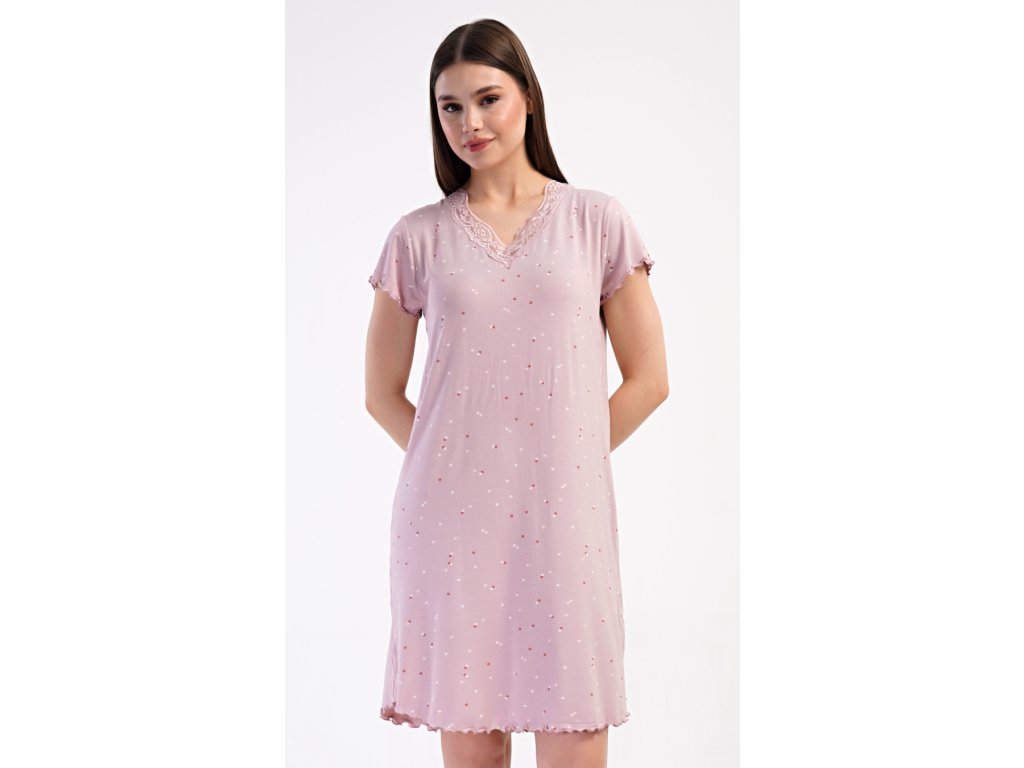Dámská noční košile s krátkým rukávem Iris. Noční košile s příjemnou délkou po kolena má žlábkování na rukávech a spodním lemu, výstřih je ozdoben krajkou. Na látce košile jsou natištěny drobné puntíky. Použitý viskózový materiál s příměsí lycry je příjemný a poddajný na dotek.