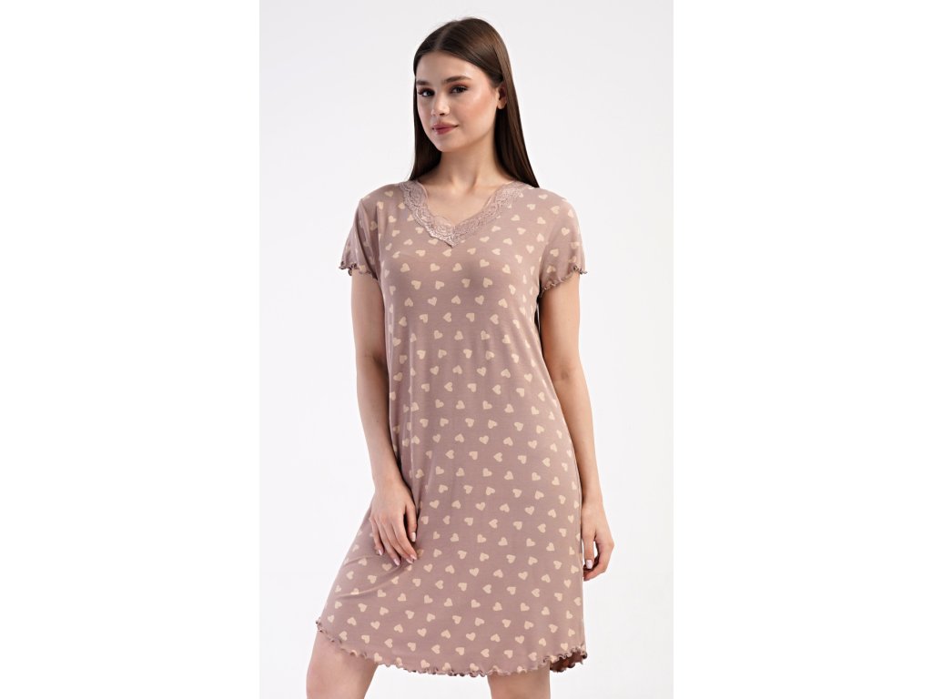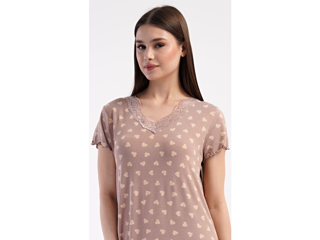 Dámská noční košile s krátkým rukávem Srdíčka. Noční košile s příjemnou délkou po kolena má žlábkování na rukávech a spodním lemu, výstřih je ozdoben krajkou. Na látce košile jsou natištěná srdíčka. Použitý viskózový materiál s příměsí lycry je příjemný a poddajný na dotek.