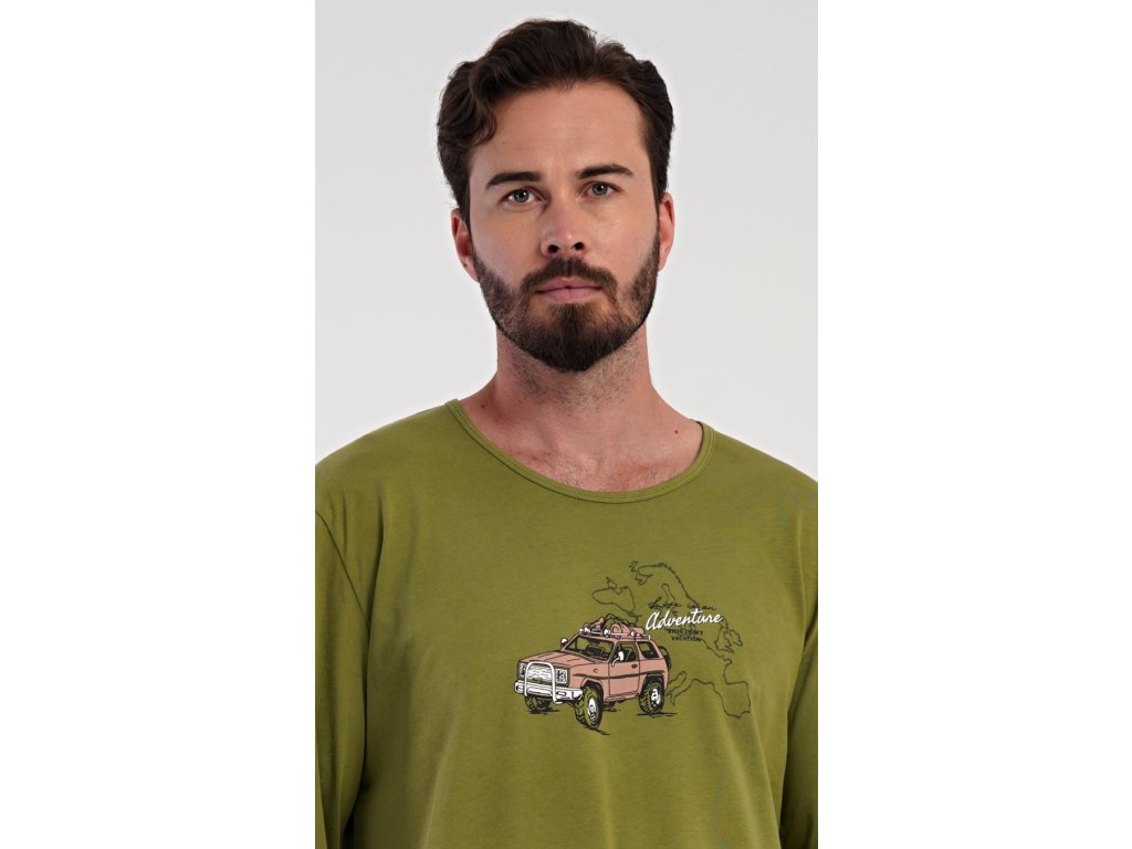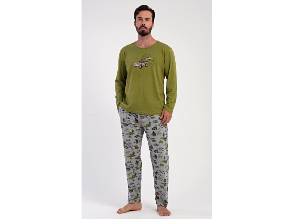 Pánské dlouhé pyžamo Adventure. Pánské pyžamo se skládá z trika s dlouhým rukávem a dlouhých kalhot. Triko je jednobarevné, zdobené na hrudi obrázkem terénního auta. Kalhoty mají v pase gumu, šňůrku na stažení a praktické kapsy. Použitý materiál je příjemný a poddaný na dotek. Obsah bavlny u trika je 100% a u kalhot 70%.