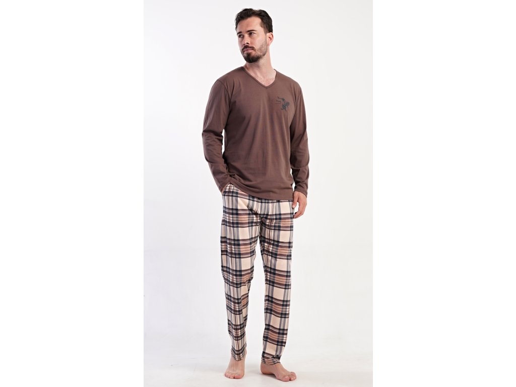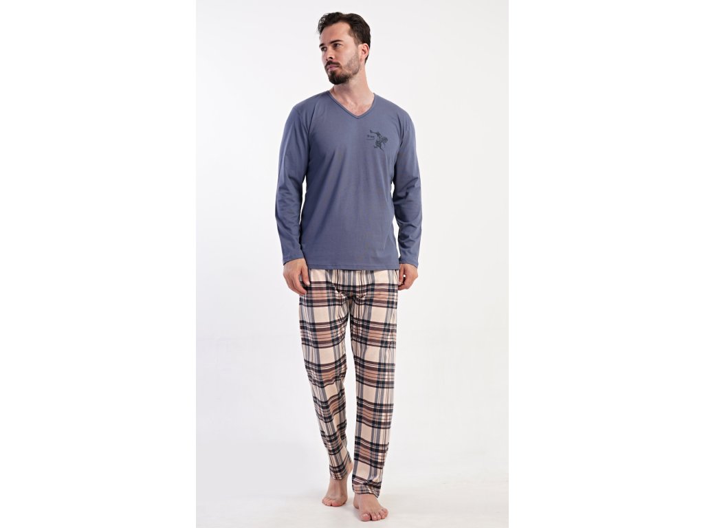 Pánské dlouhé bavlněné pyžamo Paul. Pánské pyžamo se skládá z trika s dlouhým rukávem a dlouhých kalhot. Triko je jednobarevné, zdobené na hrudi drobným obrázkem. Kostkované kalhoty mají v pase gumu, šňůrku na stažení a praktické kapsy. Použitý materiál s obsahem bavlny 100% je poddajný a příjemný na dotek.