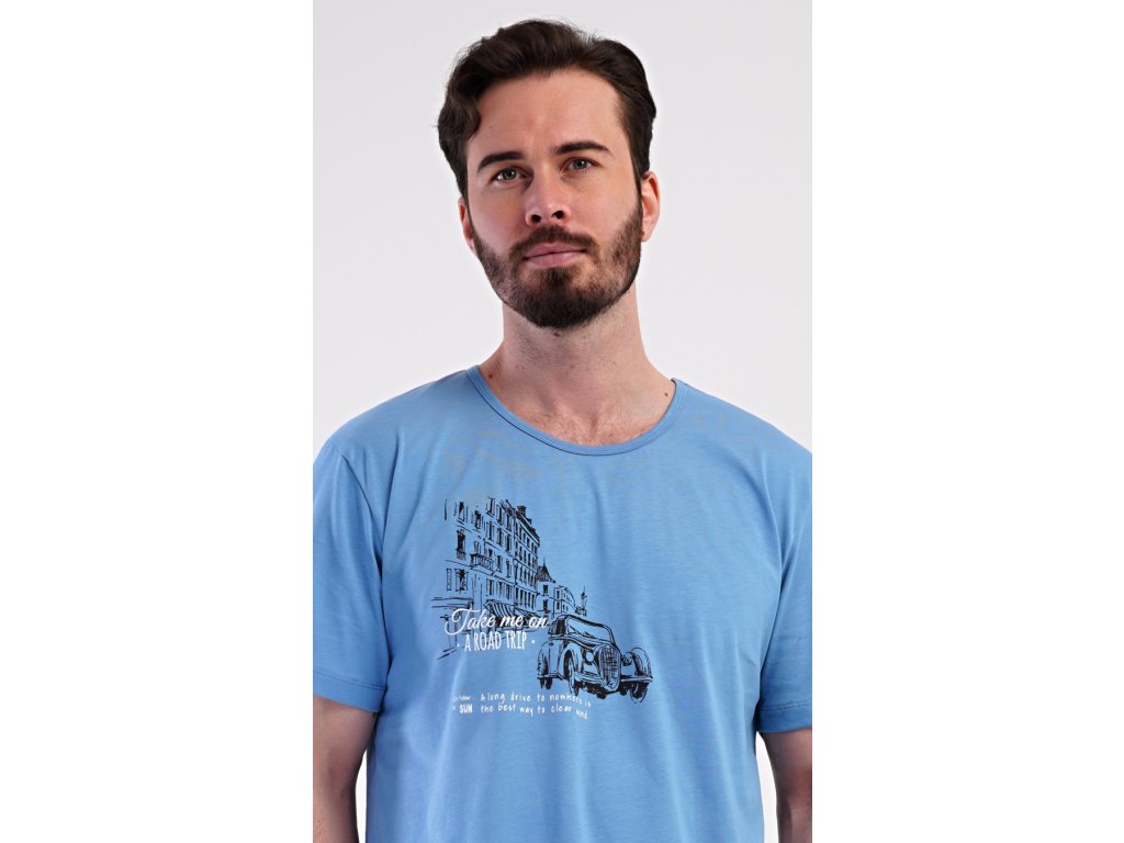 Pánské bavlněné šortkové pyžamo Felix. Pánské pyžamo se skládá z trička s krátkým rukávem a krátkých šortkových kalhot. Tričko s kulatým výstřihem zdobí na hrudi obrázek historického auta. Tričko doplňují kárované šortky, které mají v pase gumu, šňůrku na stažení a praktické kapsy. Použitý materiál s obsahem bavlny 100% je příjemný a poddajný na dotek.