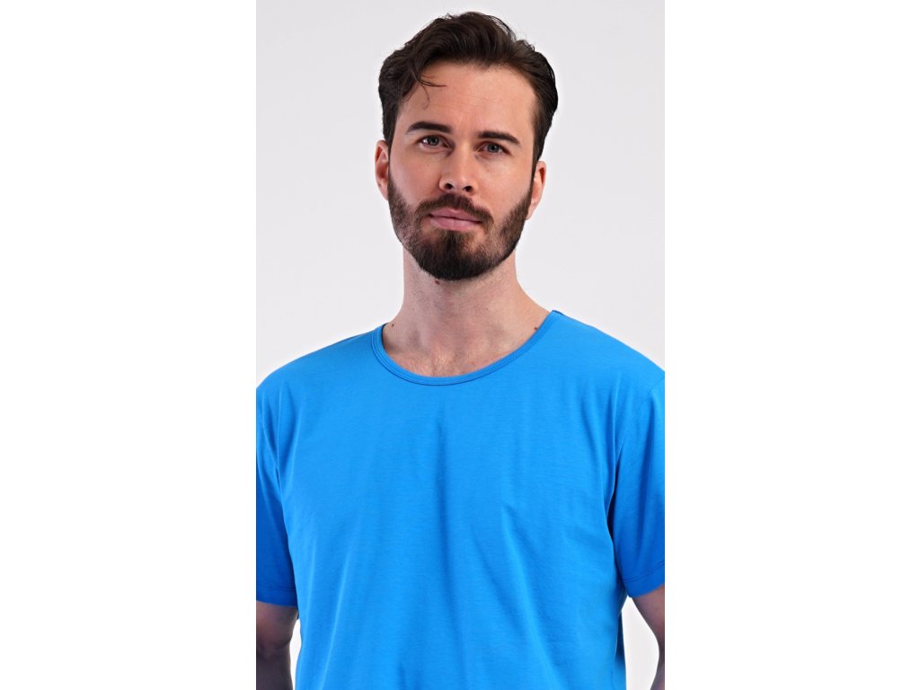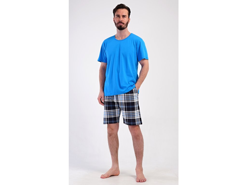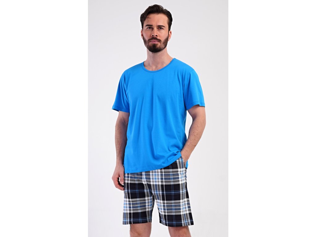 Pánské bavlněné šortkové pyžamo Henry. Pánské pyžamo se skládá z trička s krátkým rukávem a krátkých šortkových kalhot. Jednobarevné tričko má kulatý výstřih a je vhodné pro všechny milovníky pohodlné módy bez potisku. Tričko doplňují kárované šortky, které mají v pase gumu, šňůrku na stažení a praktické kapsy. Použitý materiál s obsahem bavlny 100% je příjemný a poddajný na dotek.