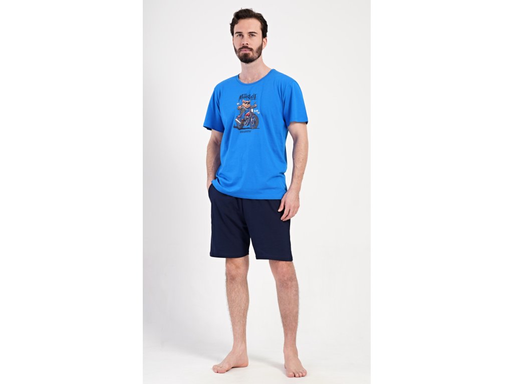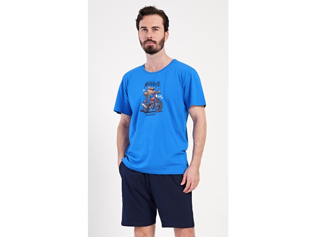 Pánské bavlněné šortkové pyžamo Motorkář. Pánské pyžamo se skládá z trička s krátkým rukávem a krátkých šortkových kalhot. Na jednobarevném tričku je obrázek medvěda na motorce a nápis 'Motorcycle'. Šortky mají praktické kapsy, v pase gumu a šňůrku na stáhnutí. Použitý materiál s podílem bavlny 100% je příjemný a poddaný na dotek. Pyžamo je vhodné i na denní nošení a oceníte ho obzvlášť v horkých letních dnech.
